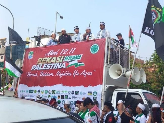Ketua DPRD Kota Bekasi H. M. Saifuddaulah hadir memberikan orasinya dari atas mobil komando aksi menyerukan agar seluruh warga Kota Bekasi memberikan dukungan kepada rakyat Palestina yang tertindas oleh kedzaliman Zionis Israel.